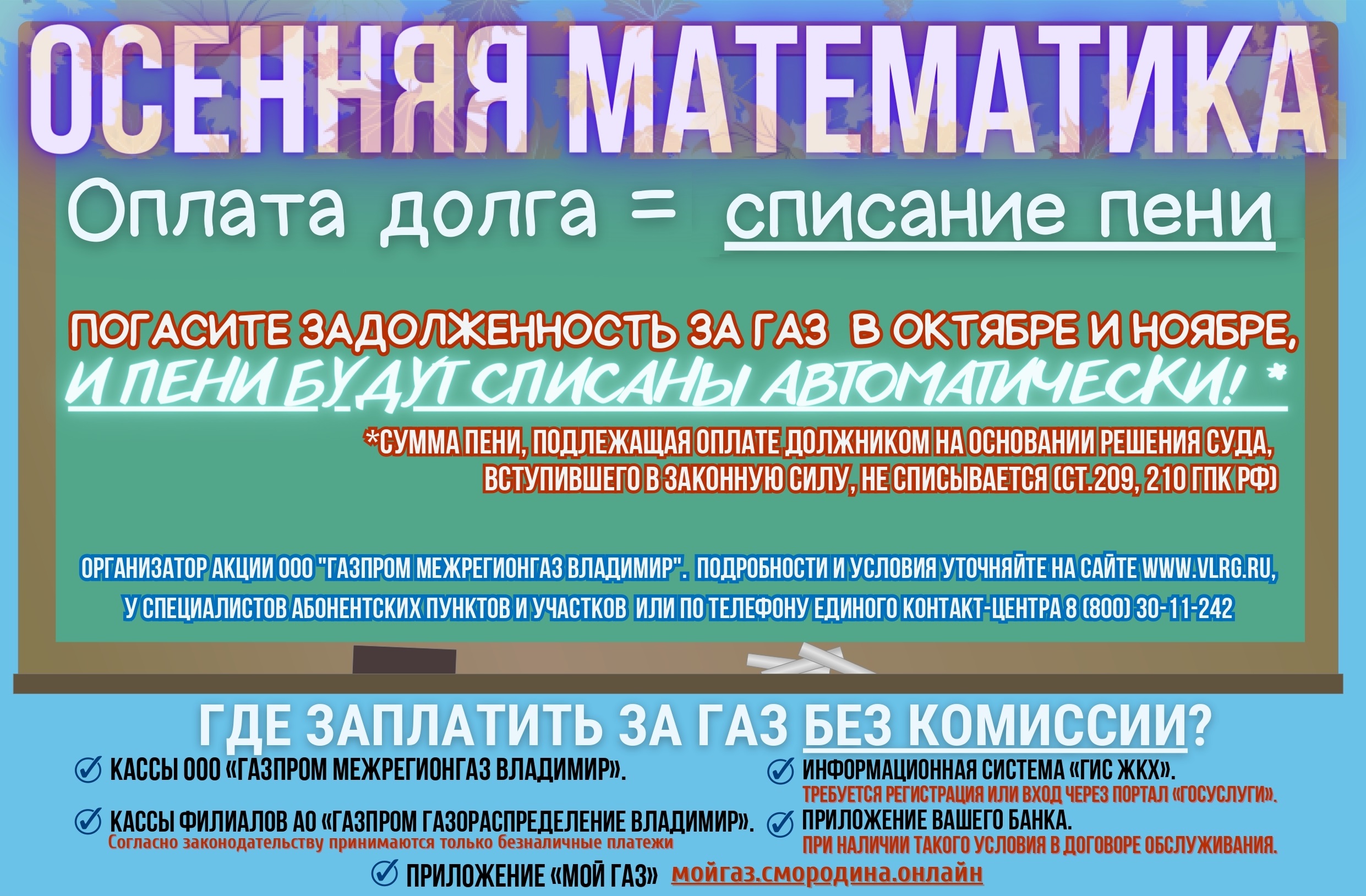 Предоставлять квитанции об оплате не нужно – все платежи будут учтены автоматически. В итоге компания «Газпром межрегионгаз Владимир» спишет задолженность по пени, накопленную в прошлые периоды. Перерасчет по пени абоненты увидят в ноябрьских или в декабрьских квитанциях, в зависимости от периода оплаты. Принять участие в акции «Пени исчезают осенью!» возможно, если: - абонент имеет задолженность на 01.10.2025 и на 01.11.2025; - абонент имеет непогашенную пени на 01.10.2025 и на 01.11.2025 (за исключением  присужденных); - у абонента нет задолженности за причиненный экономический ущерб от несанкционированного отбора газа на 01.10.2025, на 01.11.2025 и на 01.12.2025; - оплата производится денежными средствами. Мы призываем наших потребителей не копить долги и вовремя оплачивать счета. Оперативно узнать состояние своего лицевого счета и оплатить газ без комиссии можно не выходя из дома – через сервисы Личный кабинет: «Мой газ» и «Оплата за газ». Ознакомиться со всеми способами оплаты можно в специальном разделе или на обратной стороне квитанции. Организатор акции ООО «Газпром межрегионгаз Владимир». Подробности уточняйте в абонентских пунктах и участках компании, а также по телефонам единого контакт-центра 8(800)30-11-242 и (4922)40-20-40. Назад к списку  |